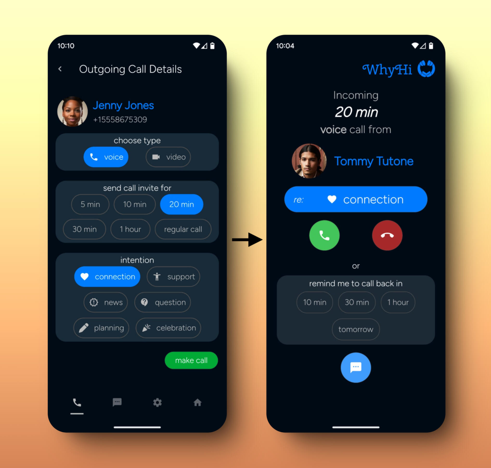 WhyHi is a phone app that lets you see the length and purpose of your calls, before you answer. Now you'll know why your friends are calling, and how long they'd like to connect.You're in control of the conversation.